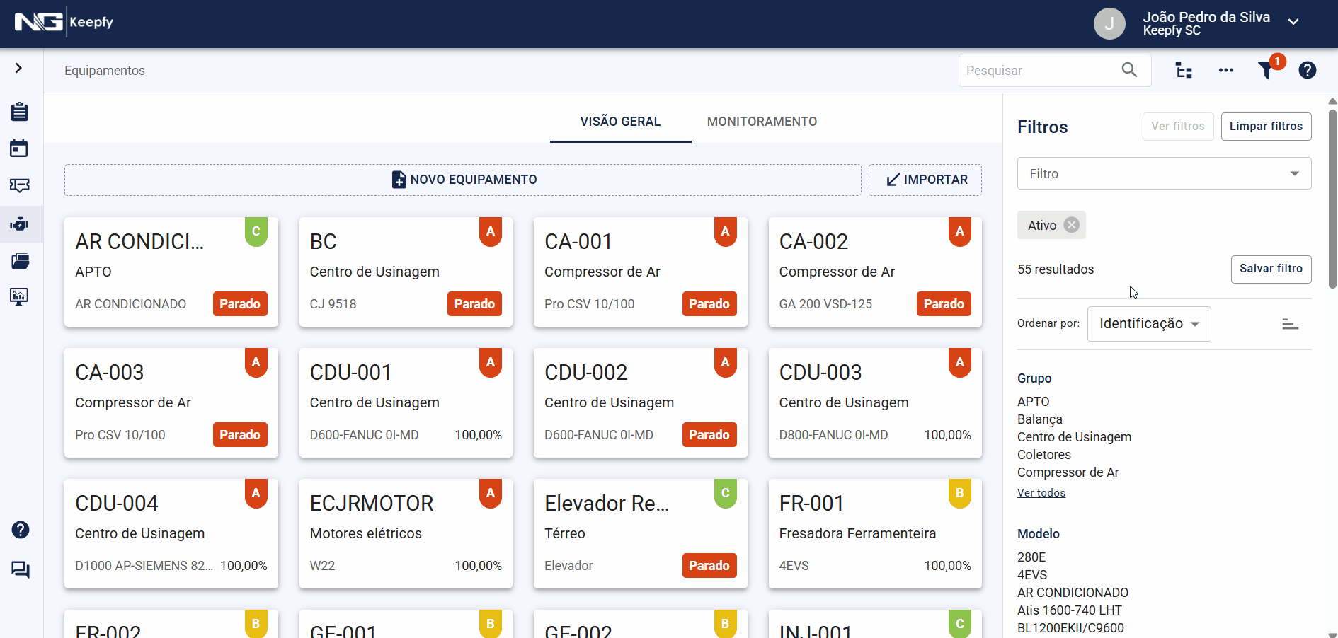 Na interface de equipamentos, a funcionalidade segue o mesmo padrão. Um exemplo de filtro salvo é aquele que lista equipamentos parados, ou seja, equipamentos que possuem ordens ou solicitações de serviço em aberto com data e hora de início de parada informadas.