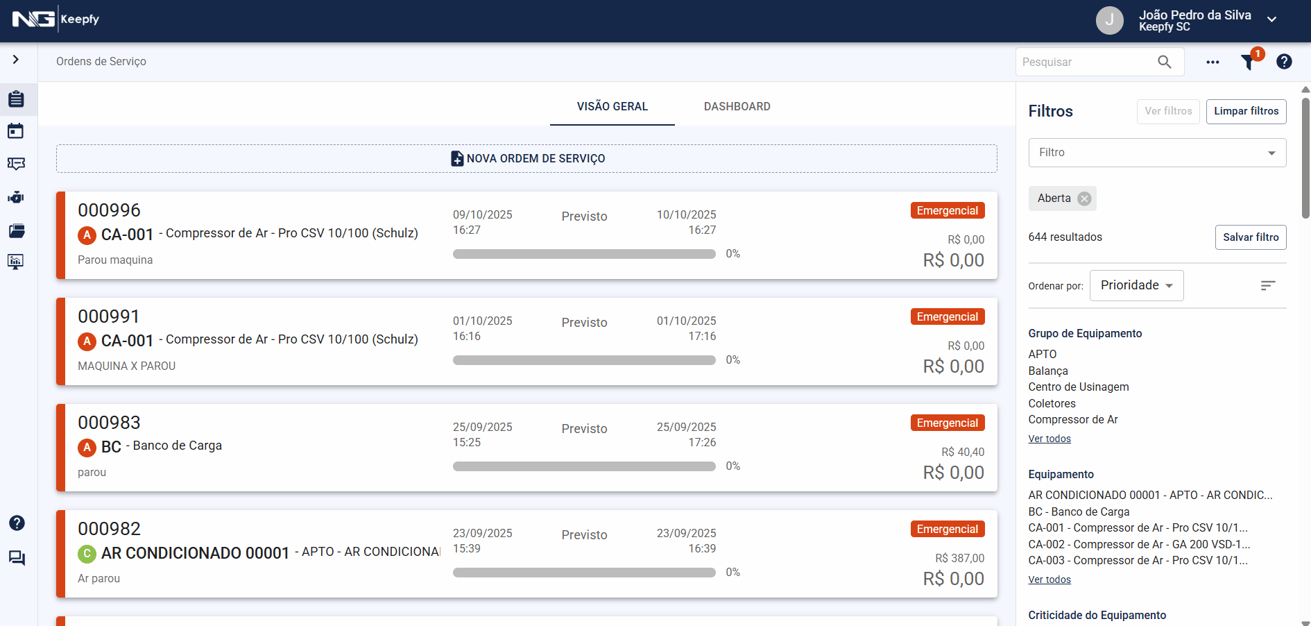 Por exemplo, é possível salvar um filtro que exiba apenas ordens de serviço abertas com prioridade emergencial, ordenadas pelo código da ordem, mantendo essa configuração sempre que o filtro for reutilizado.