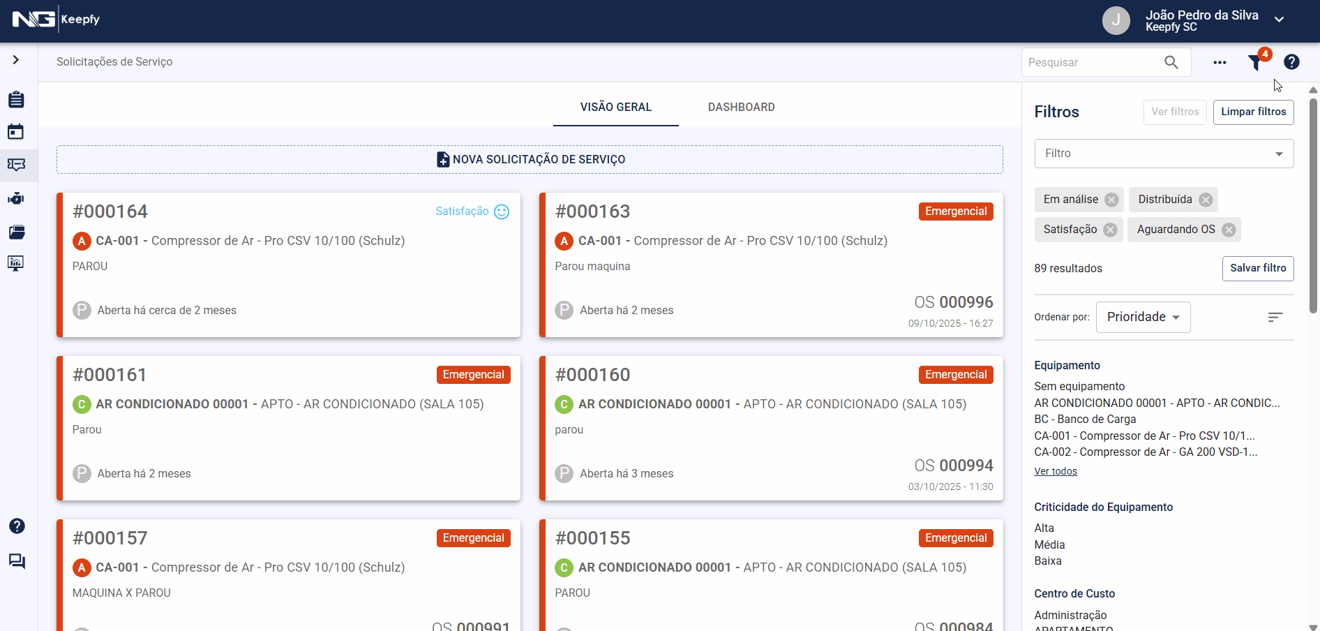 Na interface de ordens de serviço, a experiência de uso é equivalente à das solicitações. Além de salvar os critérios de filtro, o sistema também grava o estado da ordenação da listagem.
